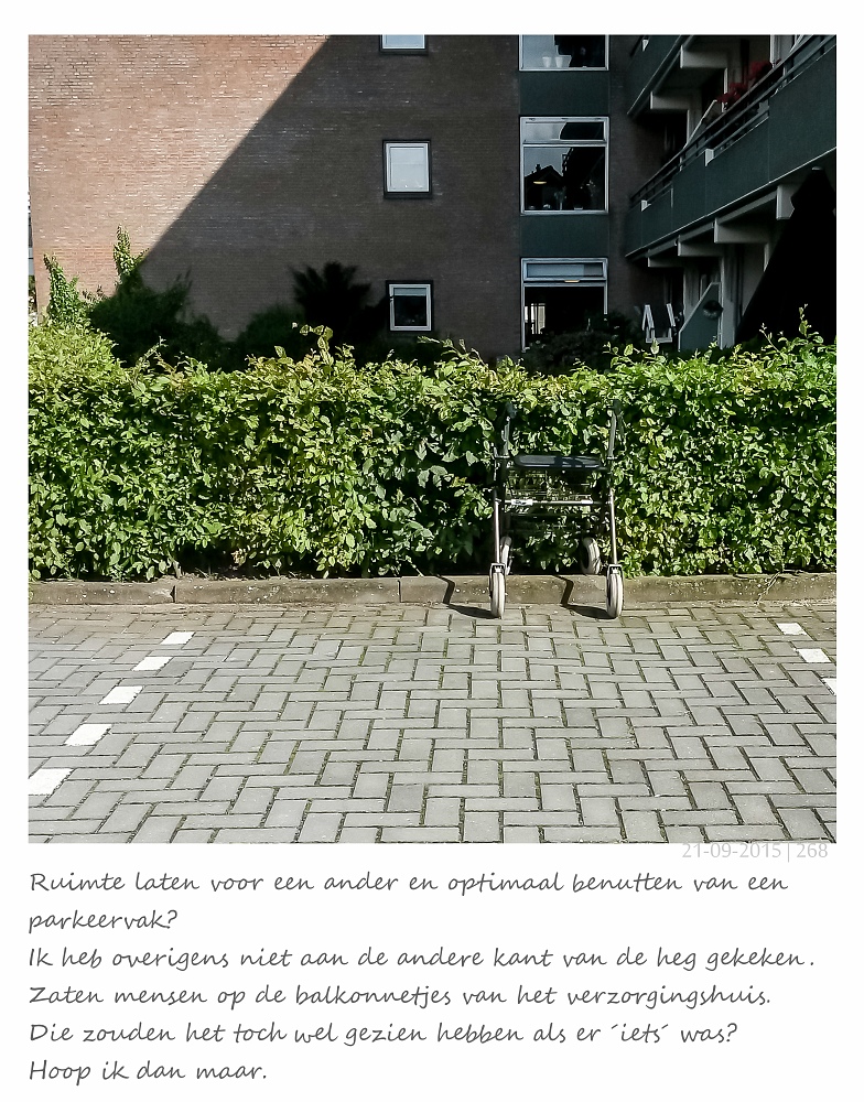 Ruim 3000 foto's staan er in het APAD-mapje in Lightroom, de reeds weggegooide foto's niet meegerekend. Soms was de oogst slechts 1 schamel fotootje per dag. Vaak op het laatste moment gemaakt of even snel gemaakt wetende dat het er die dag verder niet echt van zou komen. Het makkelijke daarvan is wel dat ik niet hoefde te kiezen. Qua presentatie wilde ik een soort eenduidigheid. Omdat ik de korte teksten die ik wilde schrijven bij de foto's als onderdeel van het totaal beeld zag heb ik gekozen voor een polaroidachtig kader. Dat leverde die eenduidigheid op en ook een (relatieve) beperking - vierkantformaat.