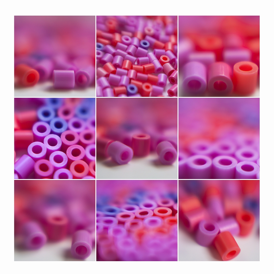 Uiteindelijk realiseerde ik me dat we nog ergens een Disney-wandklokdoos moesten hebben liggen waar vast roze in verwerkt was. En ja, dat bleek zo te zijn. En toen kwam ik in de schuur, op het punt opgeruimd te worden, een grote pot met strijkkraaltjes tegen. Daar heb ik de rozevarianten uitgezocht en ben er samen met mijn lensbaby met macrovoorzetlensjes mee aan het stoeien geweest. Dat leverde een verzameling foto's op die ik maar even in een collage gezet heb.