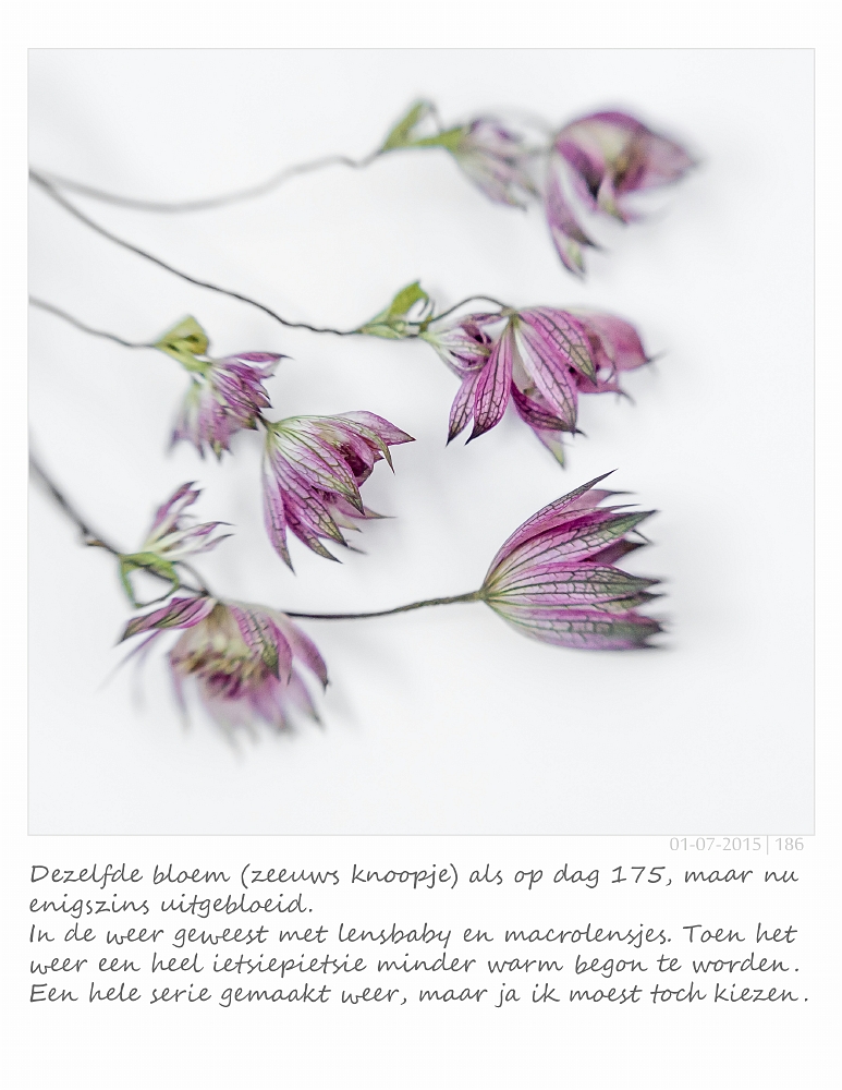 Het streven is om 365 foto's te tonen in dit album. En als het lukt in 365 achtereenvolgende dagen. Maar mocht er eens een dagje om welke reden tussen uitvallen (waar ik mezelf niet op zal aankijken) dan zal het aantal van 365 overeind blijven. En uiteindelijk zal de reeks een soort herinneringsachtig karakter krijgen van die 365 activiteiten / dingen in beeld vastgelegd. En gecomplementeerd met een klein stukje tekst als integraal onderdeel van het beeld.